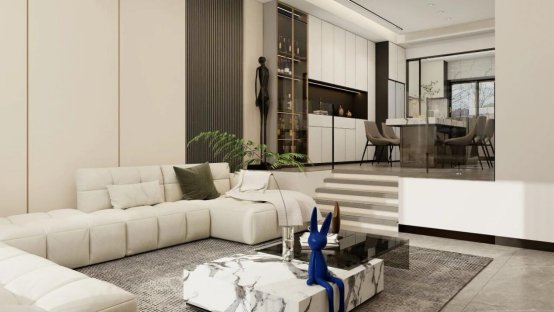 沙發(fā)背后與餐廚區(qū)定制餐邊柜采用一體化設計邏輯,通過玻璃、金屬框與同色系板材的材質呼應,以及線條的無縫延續(xù),消弭了客廳與餐廚空間的物理割裂感。