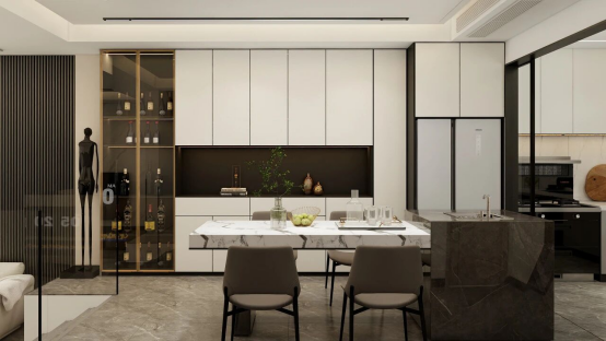 餐廳區(qū)域,餐邊柜采用“封閉柜體+玻璃酒柜”的組合形式,白色啞光柜體營造極簡基調,黑色開放格形成視覺焦點,金色金屬邊框的玻璃酒柜則如藝術展柜般,將酒品陳列轉化為空間裝飾元素,在黑白灰的主色調中注入精致感,使餐邊柜成為餐廳區(qū)域的視覺錨點,與整體空間的現(xiàn)代風格形成呼應,同時通過材質與色彩的對比,構建出富有層次的視覺節(jié)奏。