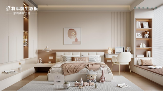 將軍牌生態(tài)板的淺原木紋理,是兒童房空間的靈魂所在,搭配清爽通透的白色柜體,兩種色調(diào)碰撞出治愈感滿滿的視覺體驗(yàn),既不沉悶也不單薄,讓兒童房始終保持明亮開闊的質(zhì)感;當(dāng)陽光透過窗簾灑入時(shí),原木色書桌、衣柜泛出柔和暖光,白色面板折射出細(xì)碎光影,在墻面與地面形成靈動光斑,孩子追逐光斑嬉戲、趴在書桌涂鴉,光影與木色交織的瞬間,便是童年珍貴的畫面,這種低飽和配色契合兒童房清新調(diào)性,更能適配孩子成長過程中的軟裝變化,多年后依然不會過時(shí)。