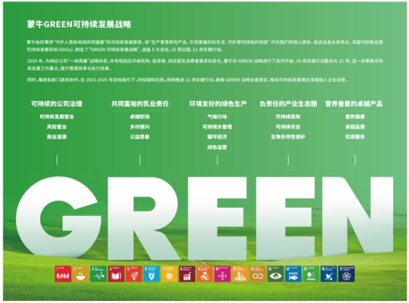 2021年,蒙牛結(jié)合自身業(yè)務(wù)特點(diǎn),深度對(duì)標(biāo)聯(lián)合國(guó)可持續(xù)發(fā)展目標(biāo)(SDGs),制訂了“GREEN可持續(xù)發(fā)展戰(zhàn)略”——G是可持續(xù)的公司治理,R是共同富裕的乳業(yè)責(zé)任,E是環(huán)境友好的綠色生產(chǎn),第二個(gè)E是負(fù)責(zé)任的產(chǎn)業(yè)生態(tài)圈,N是營(yíng)養(yǎng)普惠的卓越產(chǎn)品。