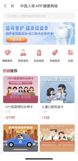 作為保險行業(yè)的龍頭企業(yè)之一,中國人保也全面發(fā)力,以“中國人?!盇PP為核心載體。打造更加貼近大眾日常健康需求的一站式解決方案。近期,該APP升級完成的“健康商城”正式上線,集成13大類健康服務(wù)場景,覆蓋體檢、齒科、眼科、中醫(yī)、用藥、母嬰、慢病管理、就醫(yī)陪診、遠(yuǎn)程問診等核心環(huán)節(jié),可滿足全年齡段、全家庭的常見健康需求,實現(xiàn)了從基礎(chǔ)健康管理到專科醫(yī)療支持、從單一用戶服務(wù)到全家庭成員覆蓋的服務(wù)閉環(huán)。